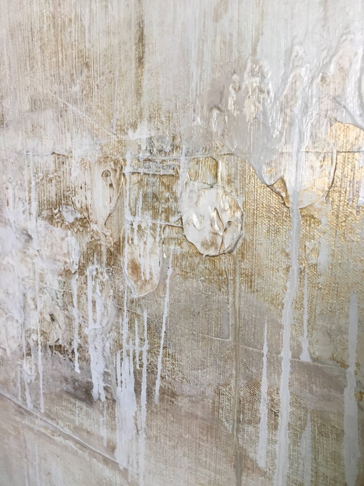 Gold and cream are the most calming colors for me. I find when I am stressed that these colors help to calm me right down, like a warm hug. “Bliss” is a 30x40 acrylic painting on canvas.